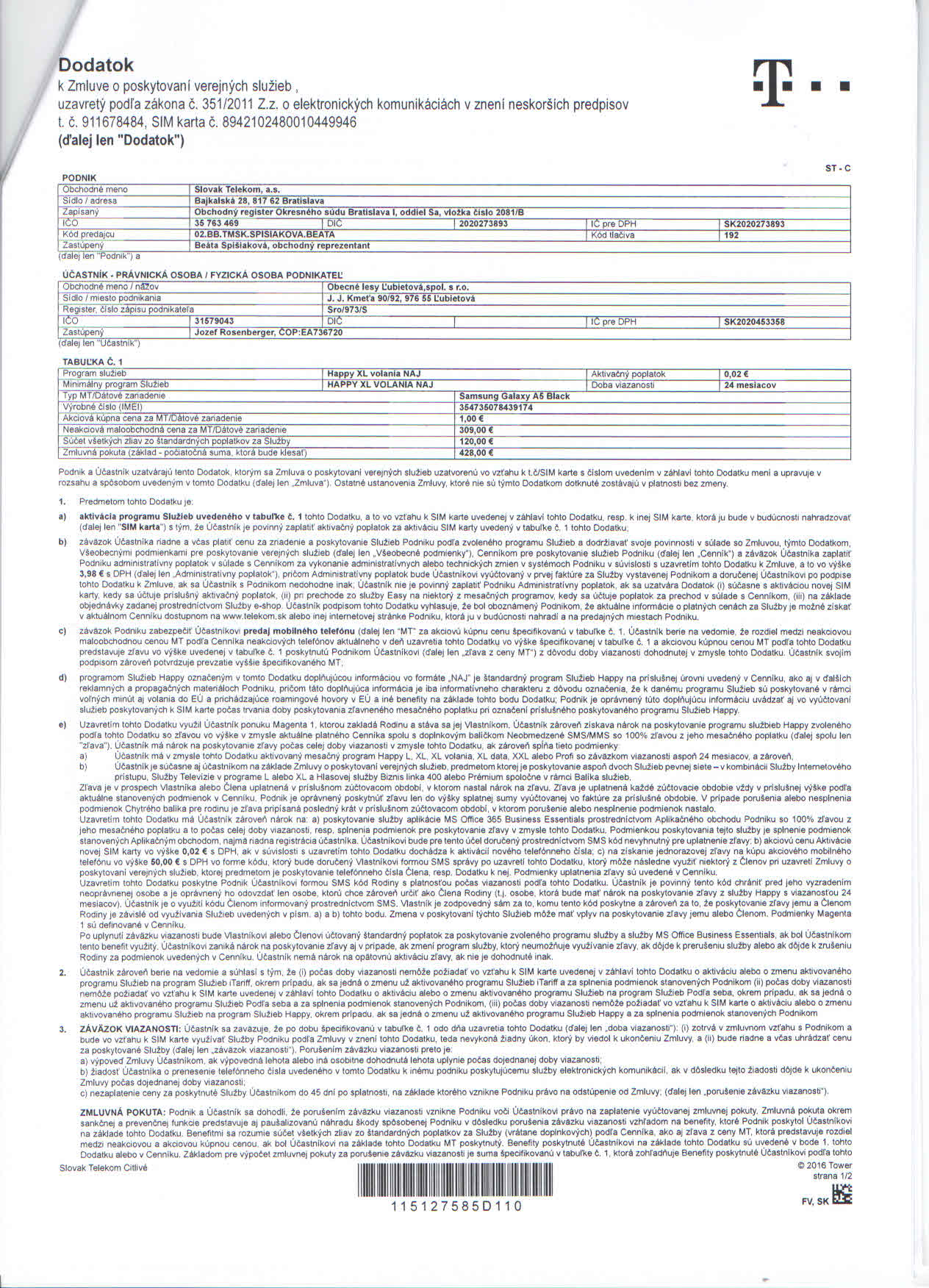 2. Zmluvná stranaSlovak Telekom a.s, Bajkalská 28, 817 62, Bratislava